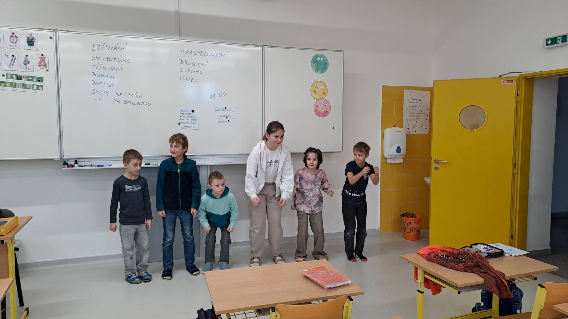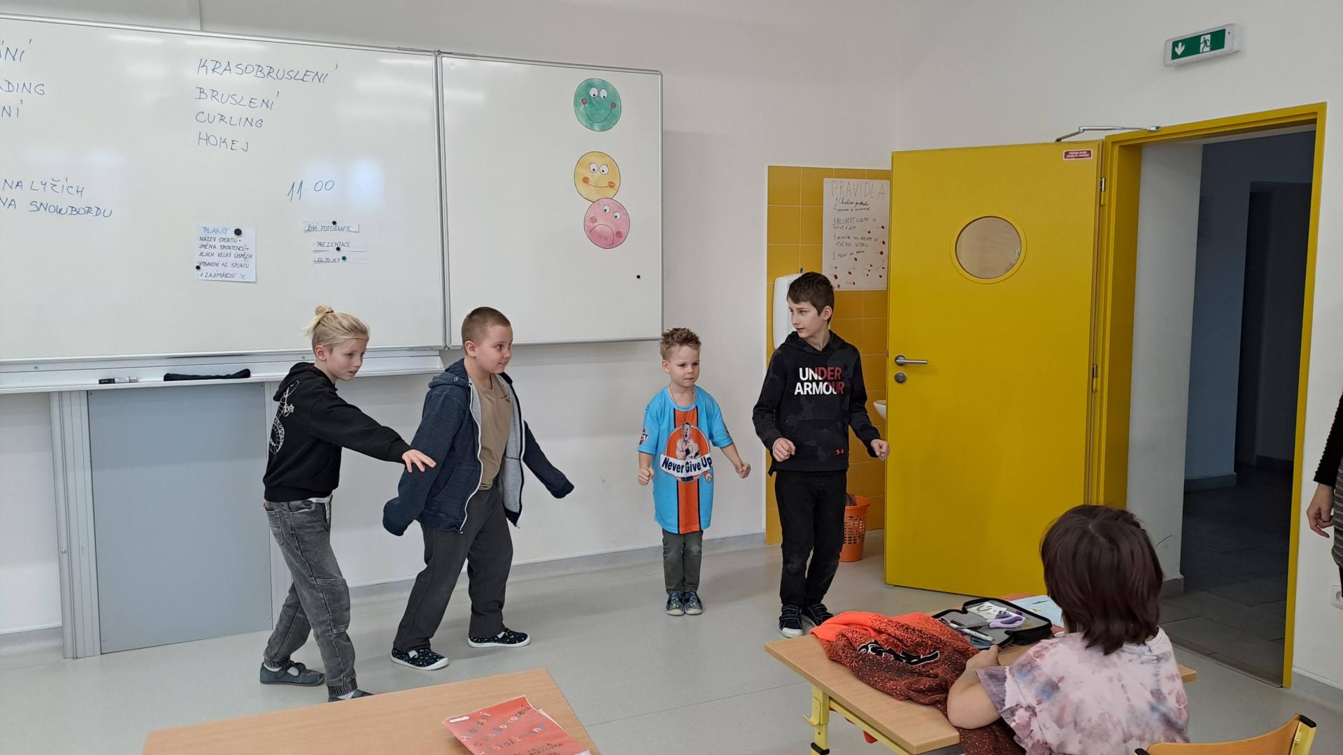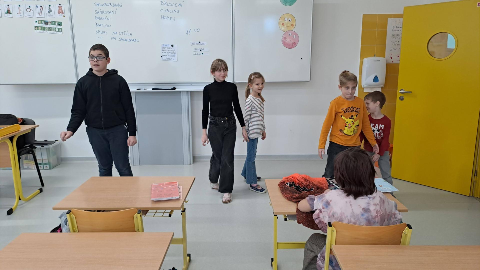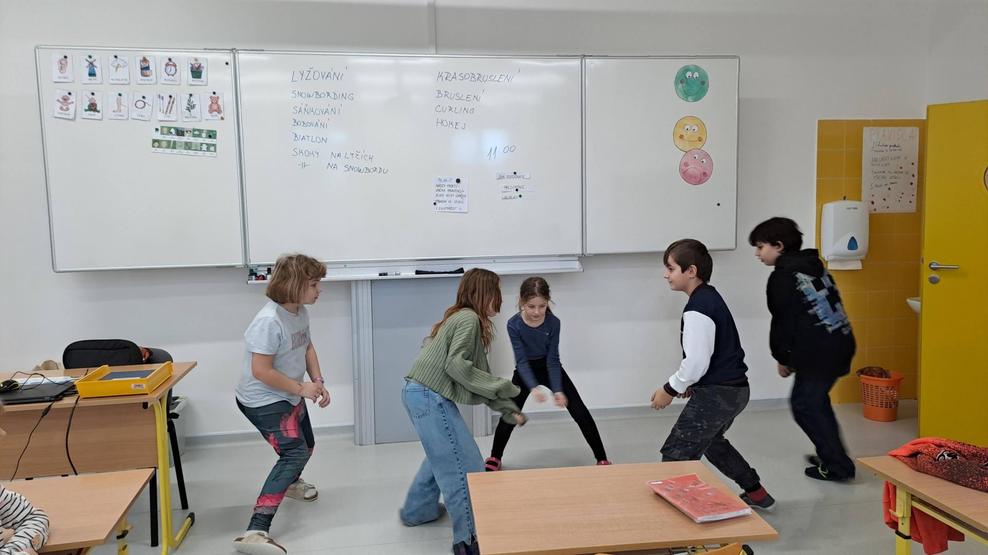 Středa – Olympiáda – Všichni žáci, kteří se nezúčastnili lyžařského výcviku, navázali na společný úterní program a zimní sporty vyústily v zimní olympiádu. S jejími disciplínami, programem, hesly a symboly se děti seznámily během dopoledne. V sokolovně si pak pod vedením paní učitelky Lucky některé sporty vyzkoušely, např. skeleton nebo biatlon. Nejvíce se žákům zapsaly hodnoty ODVAHA a PŘÁTELSTVÍ.