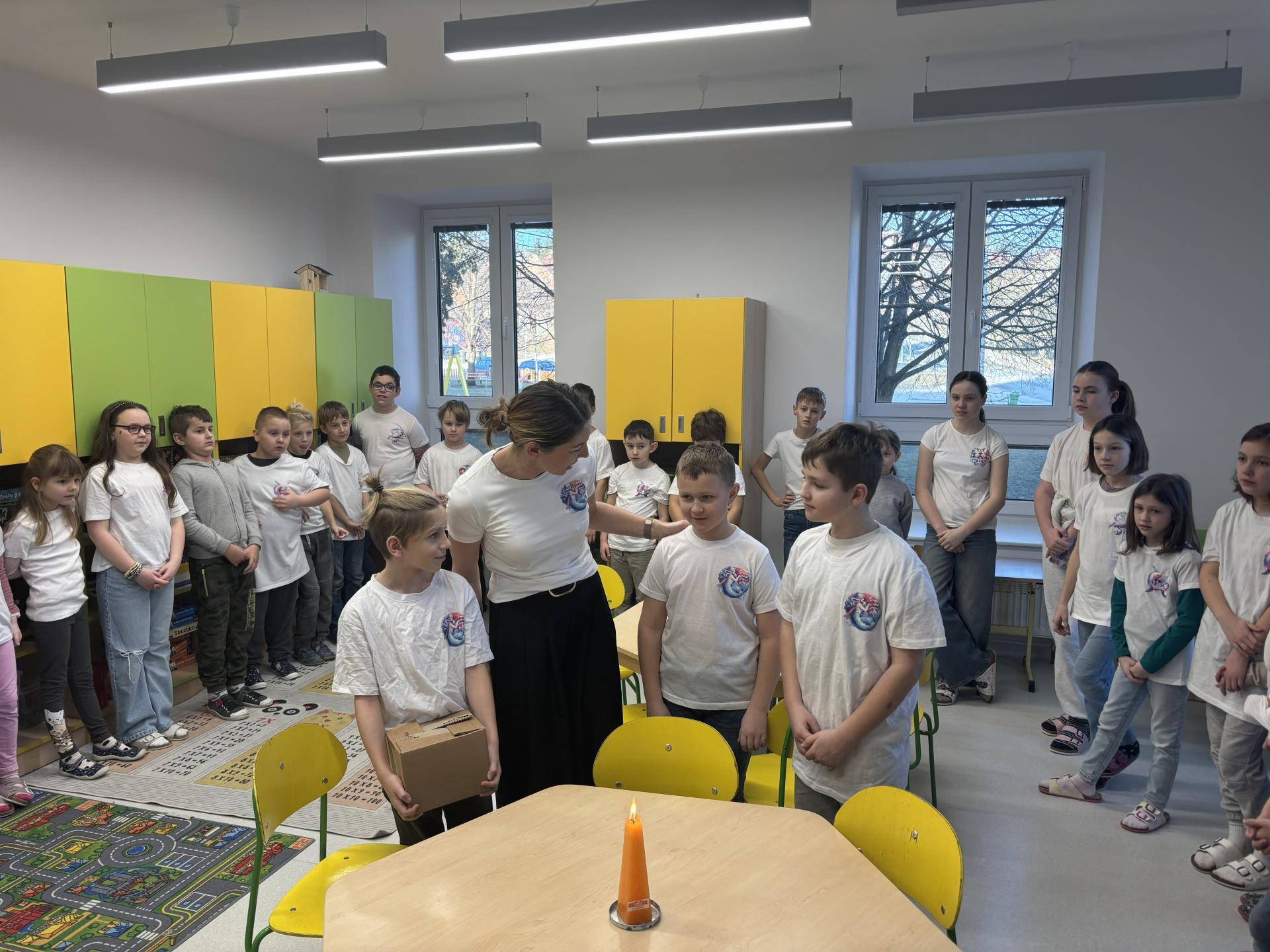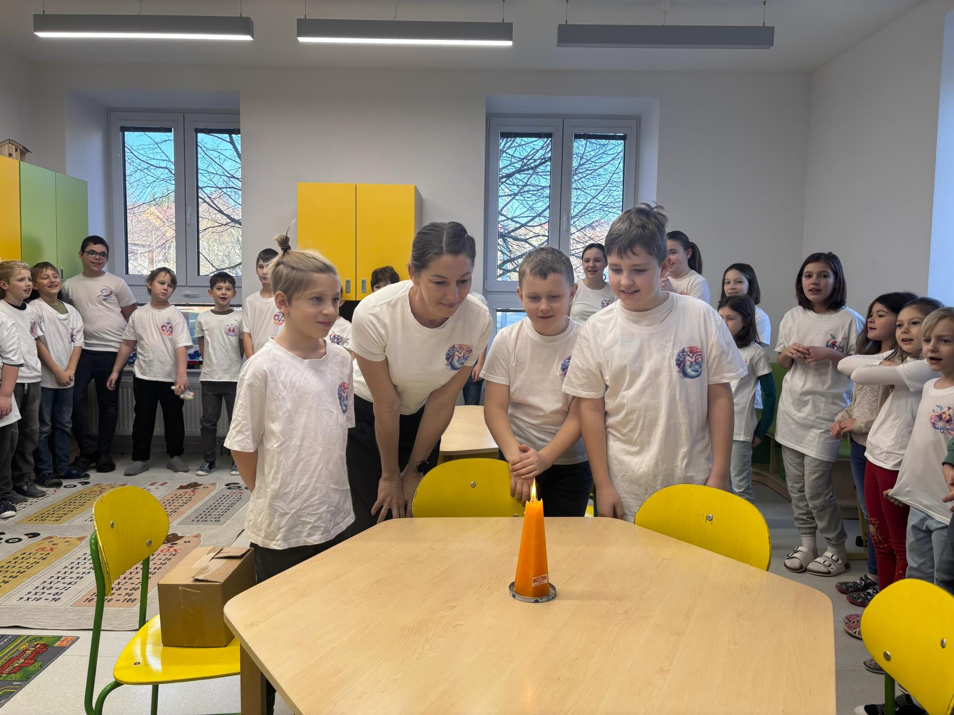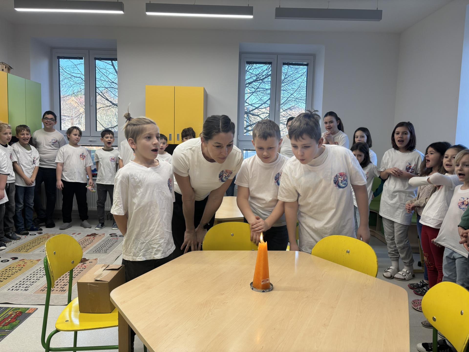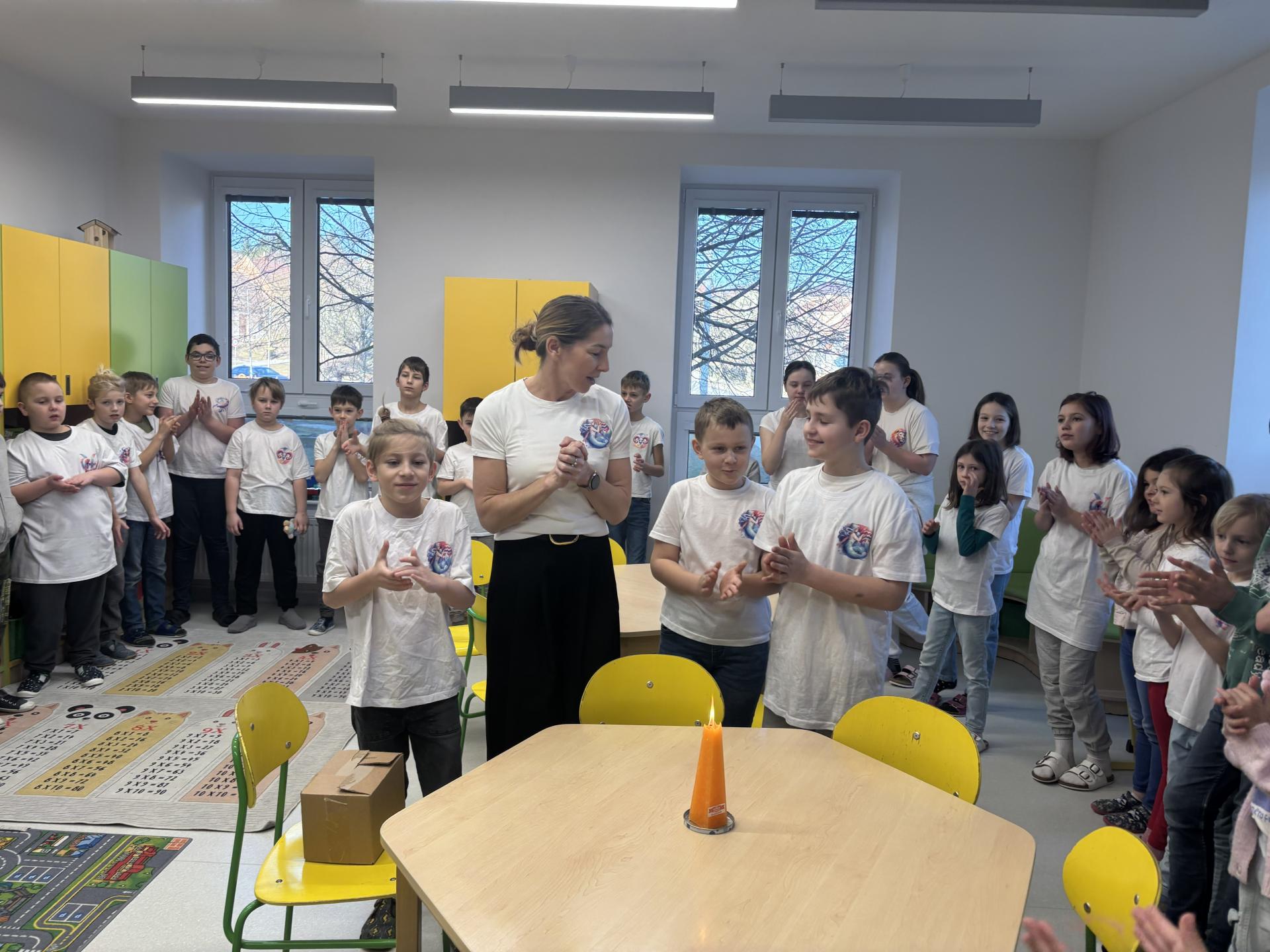 Ti slavili svoje narozeniny, a tak jsme si pomyslně přiťukli na jejich zdraví. Tobík, Denisek, Tomášek a paní učitelka Lucka si sfoukli narozeninovou svíčku, a pak už následovali gratulace od ostatních spolužáků.