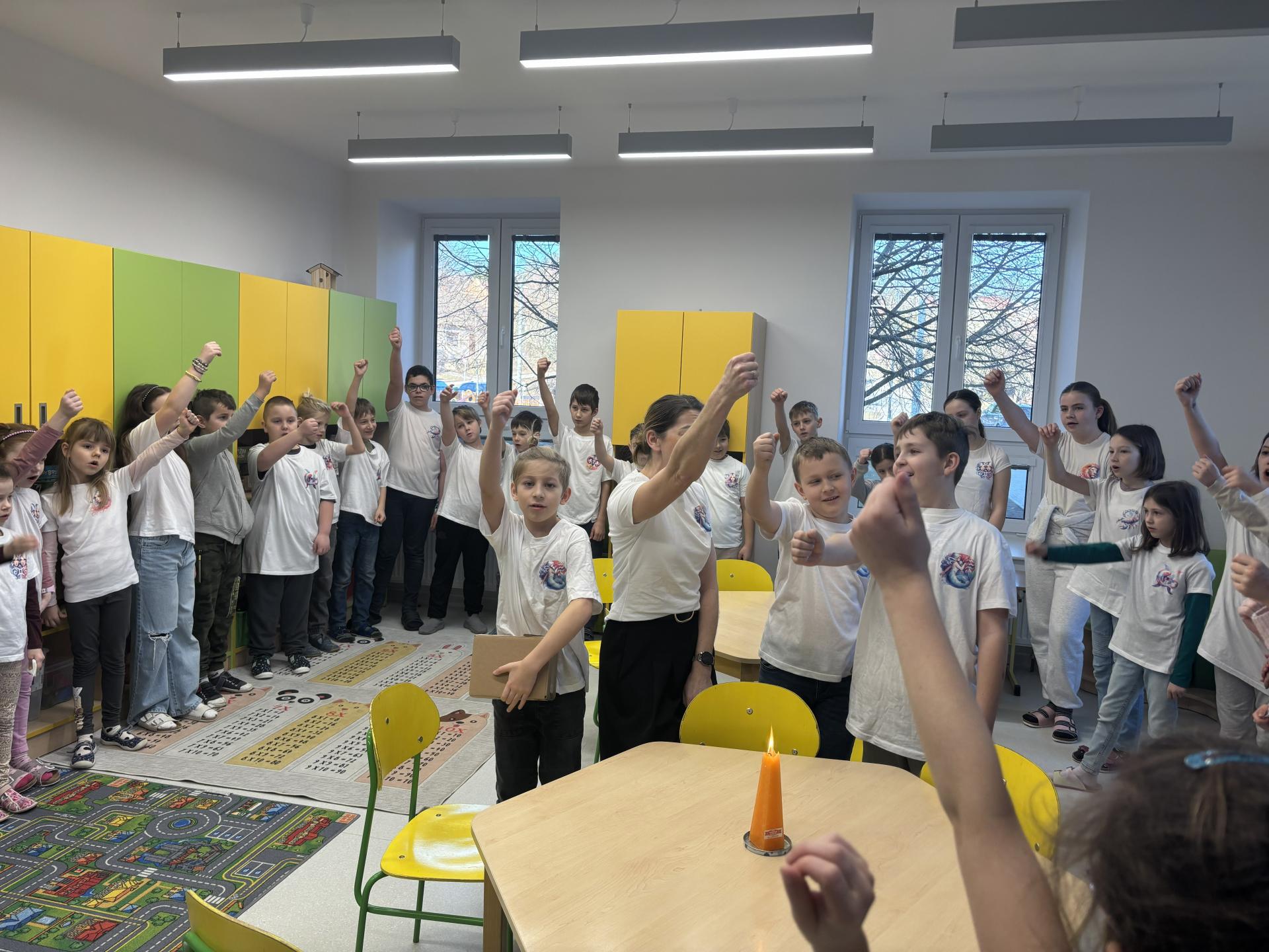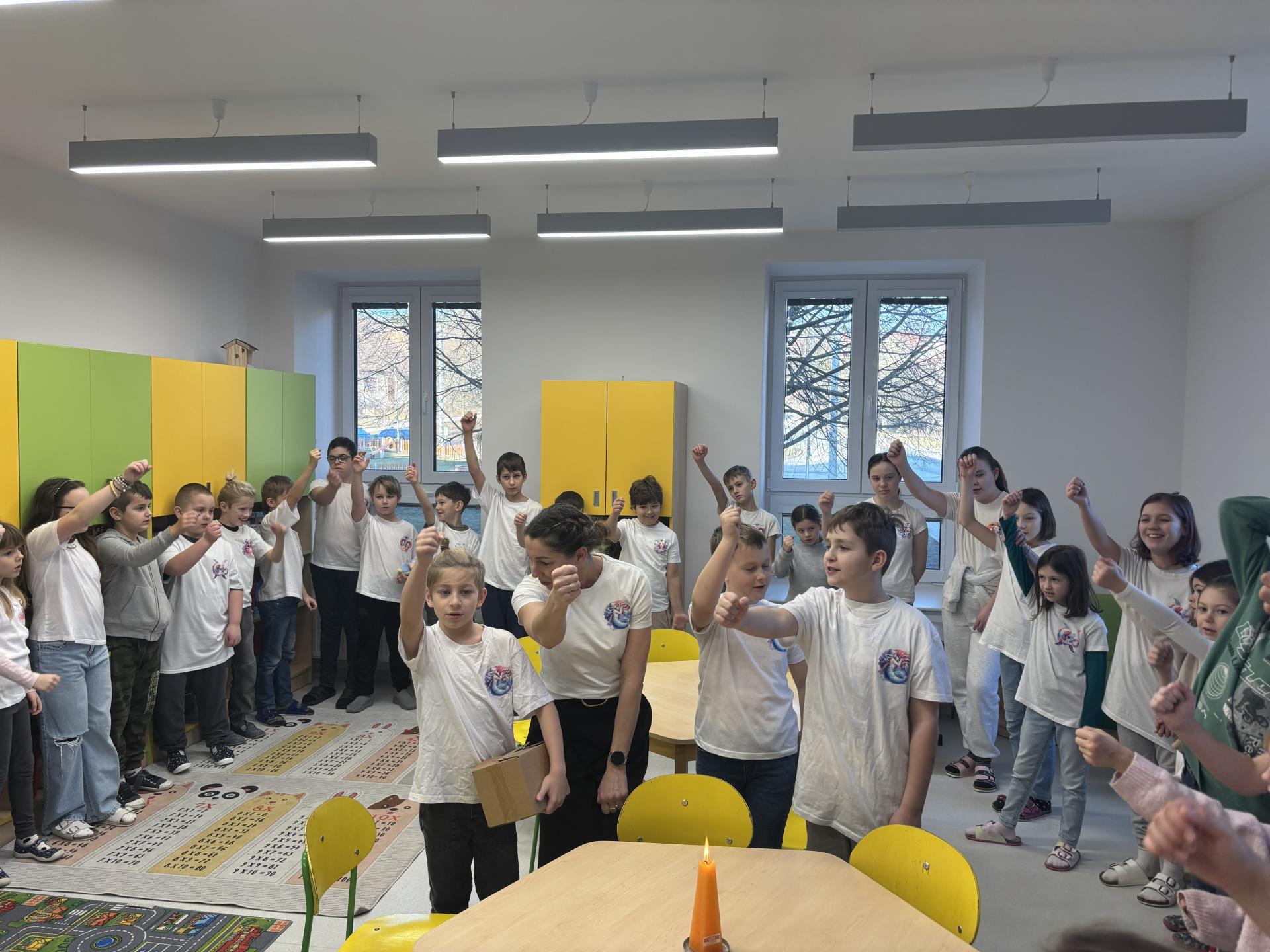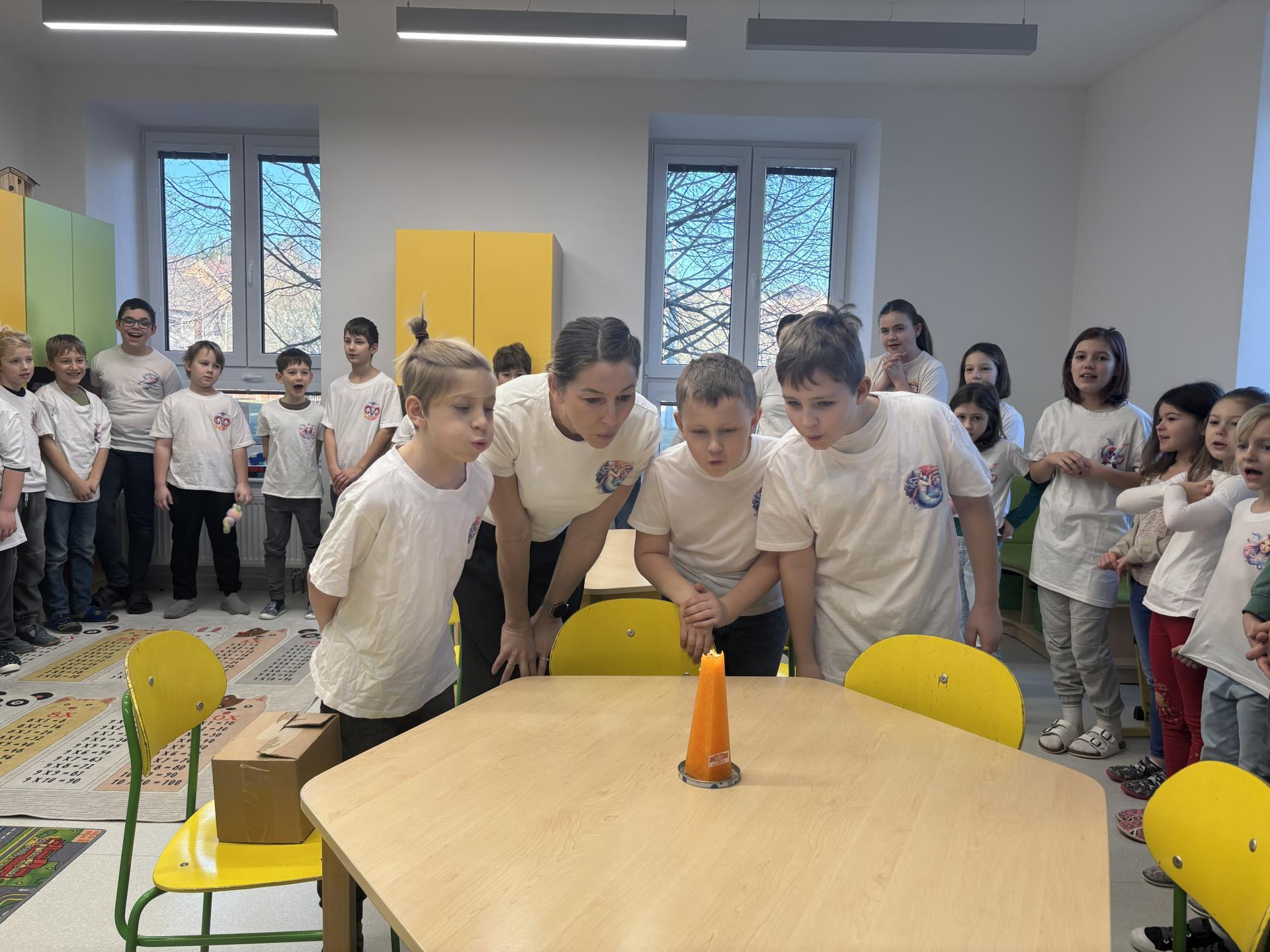 Ti slavili svoje narozeniny, a tak jsme si pomyslně přiťukli na jejich zdraví. Tobík, Denisek, Tomášek a paní učitelka Lucka si sfoukli narozeninovou svíčku, a pak už následovali gratulace od ostatních spolužáků.