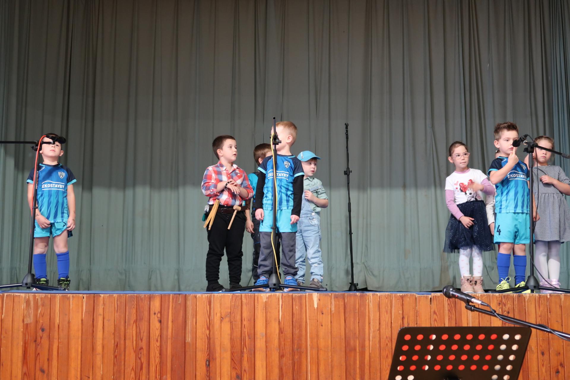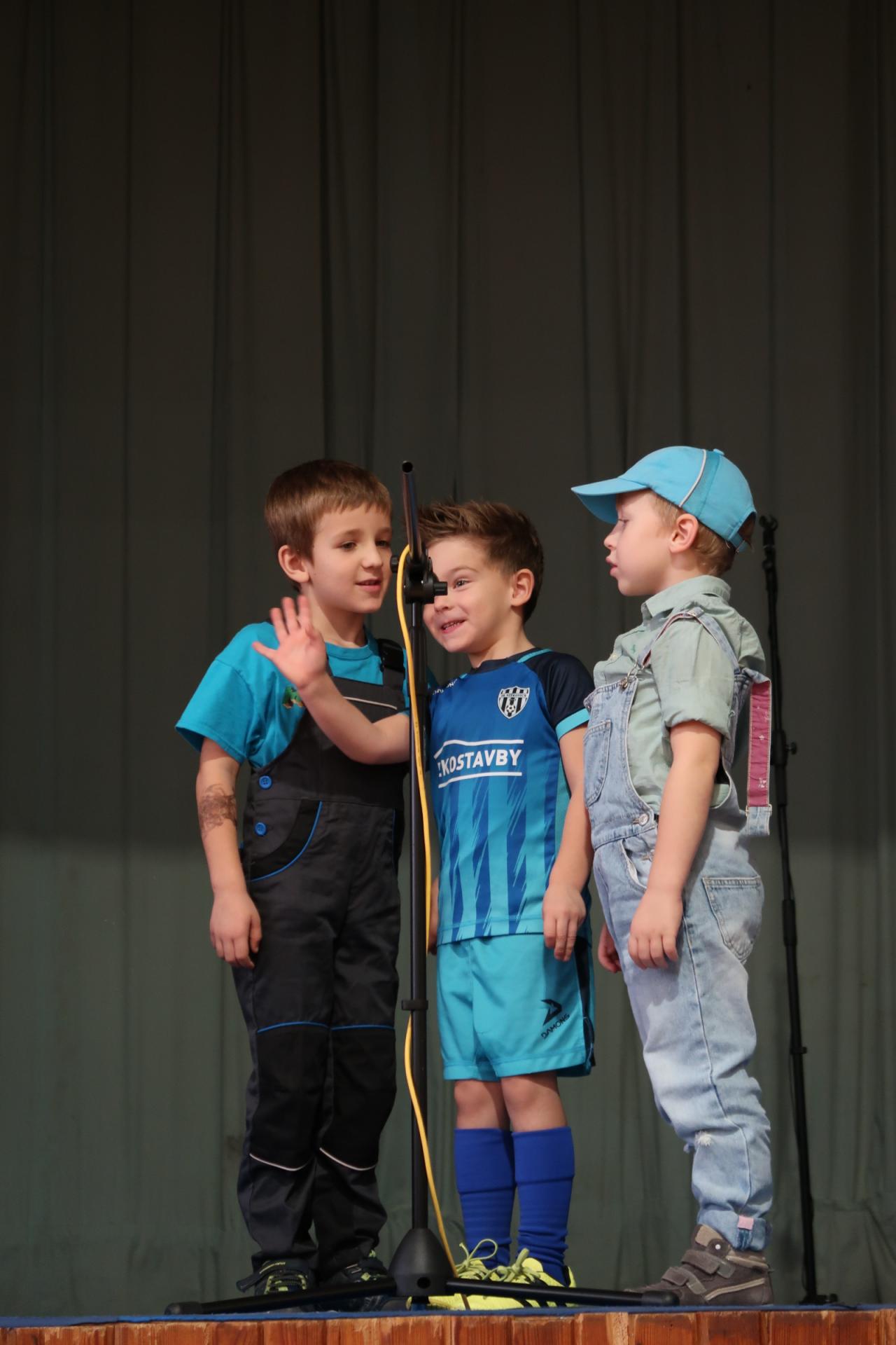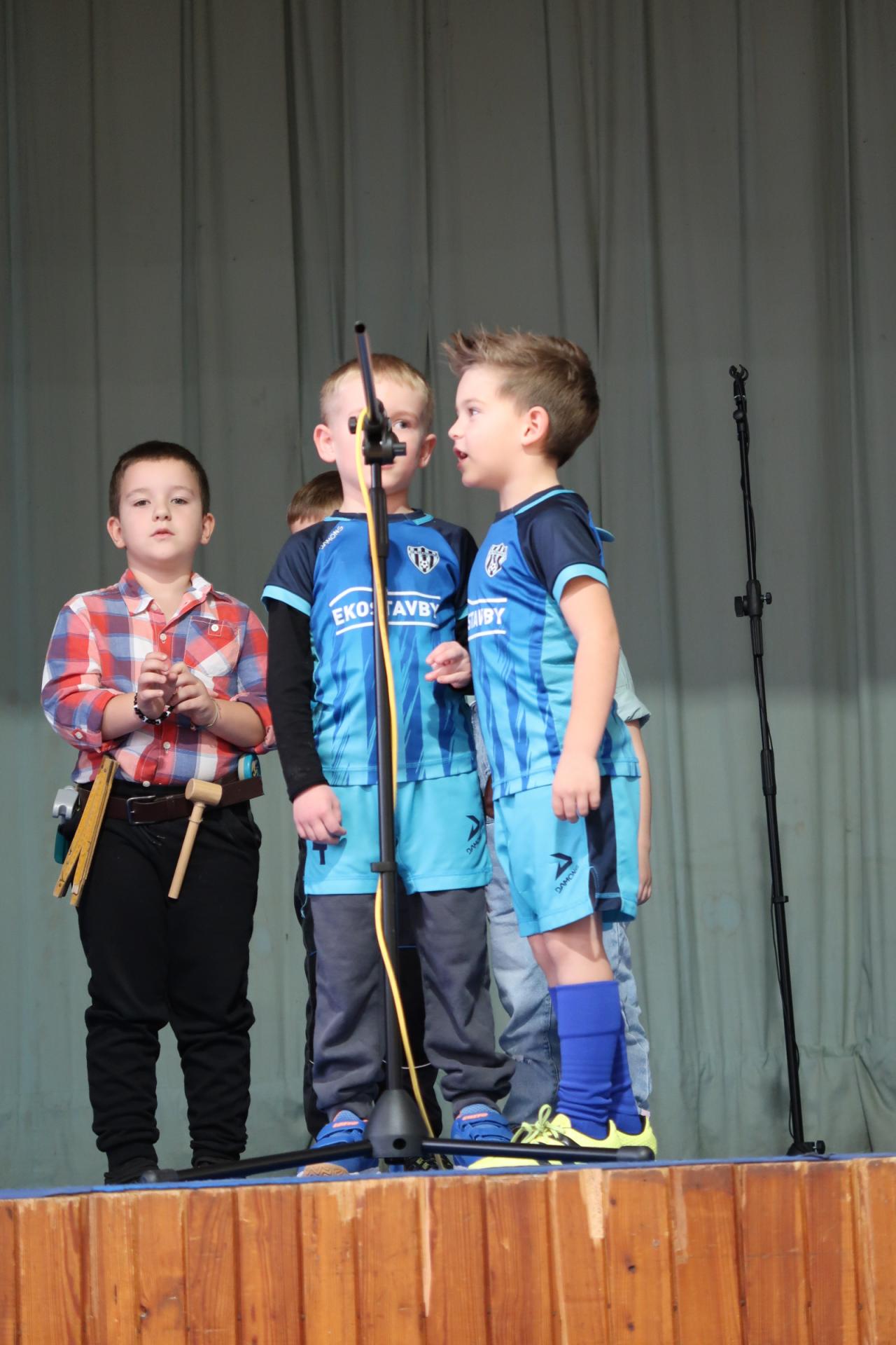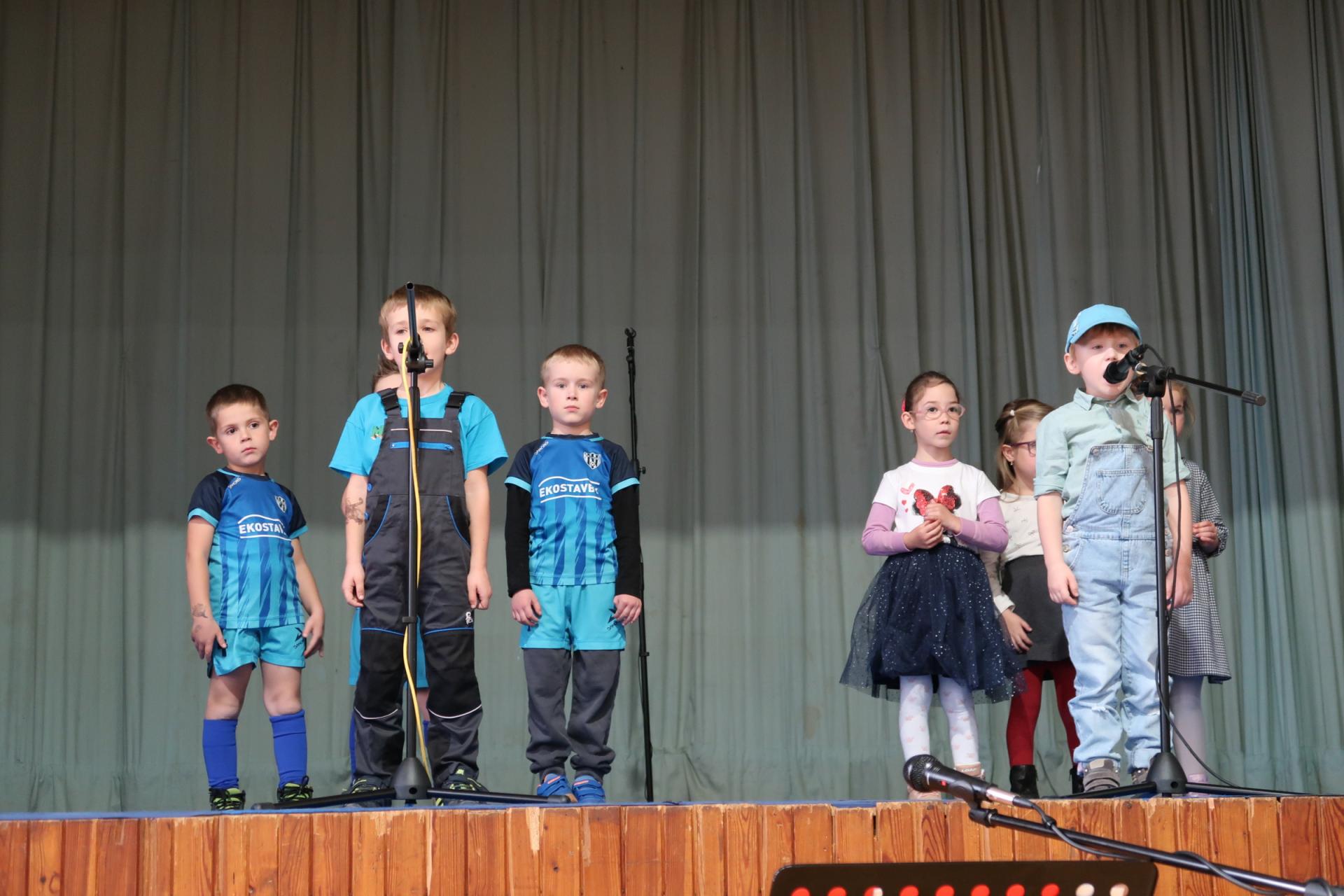 Mateřáčci vystoupili s pásmem povolání. Zarecitovali několik básniček a potěšili všechny přítomné písničkami Dělání, dělání a Ten dělá to a ten zas tohle.... Za svůj výkon sklidili velký potlesk.
