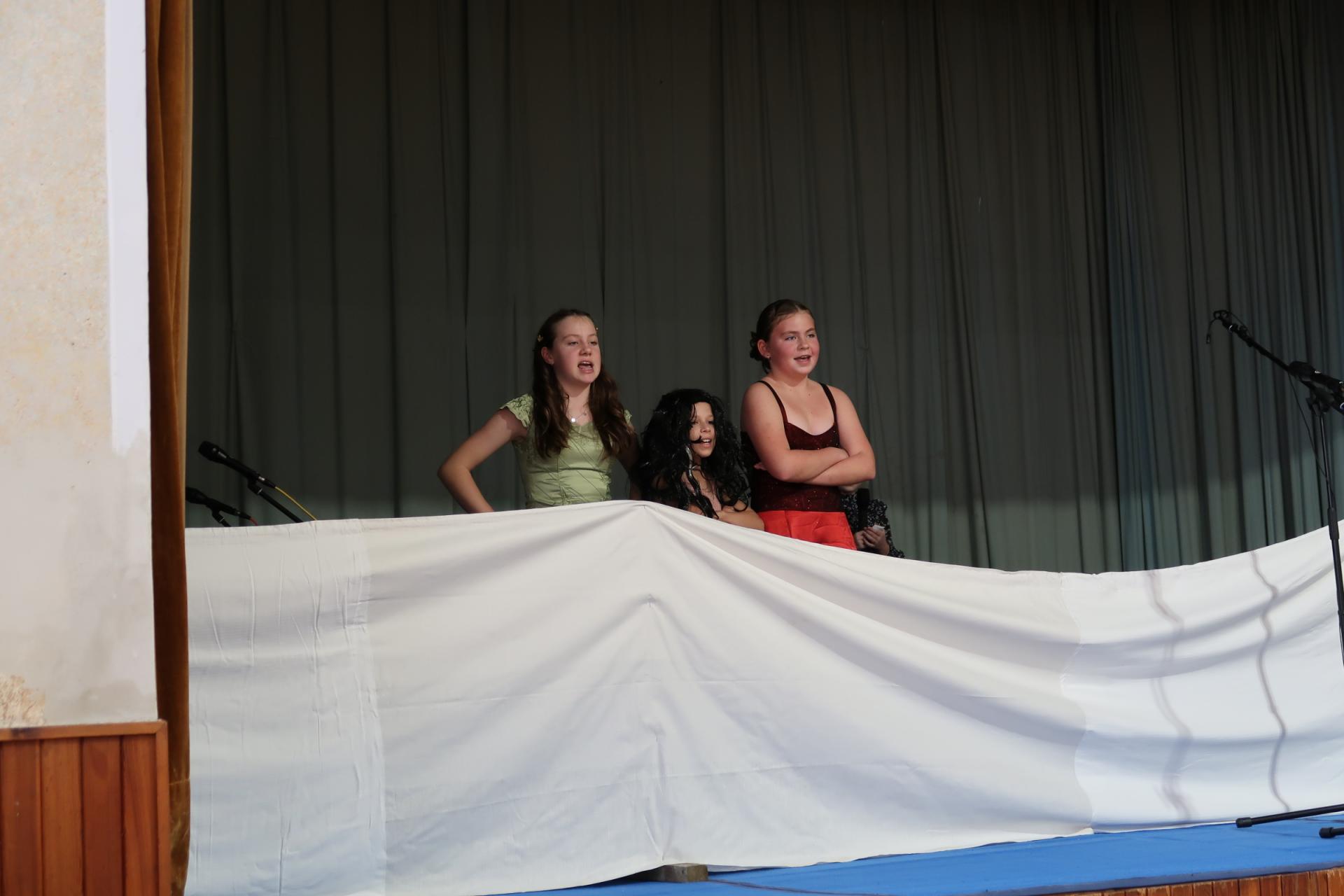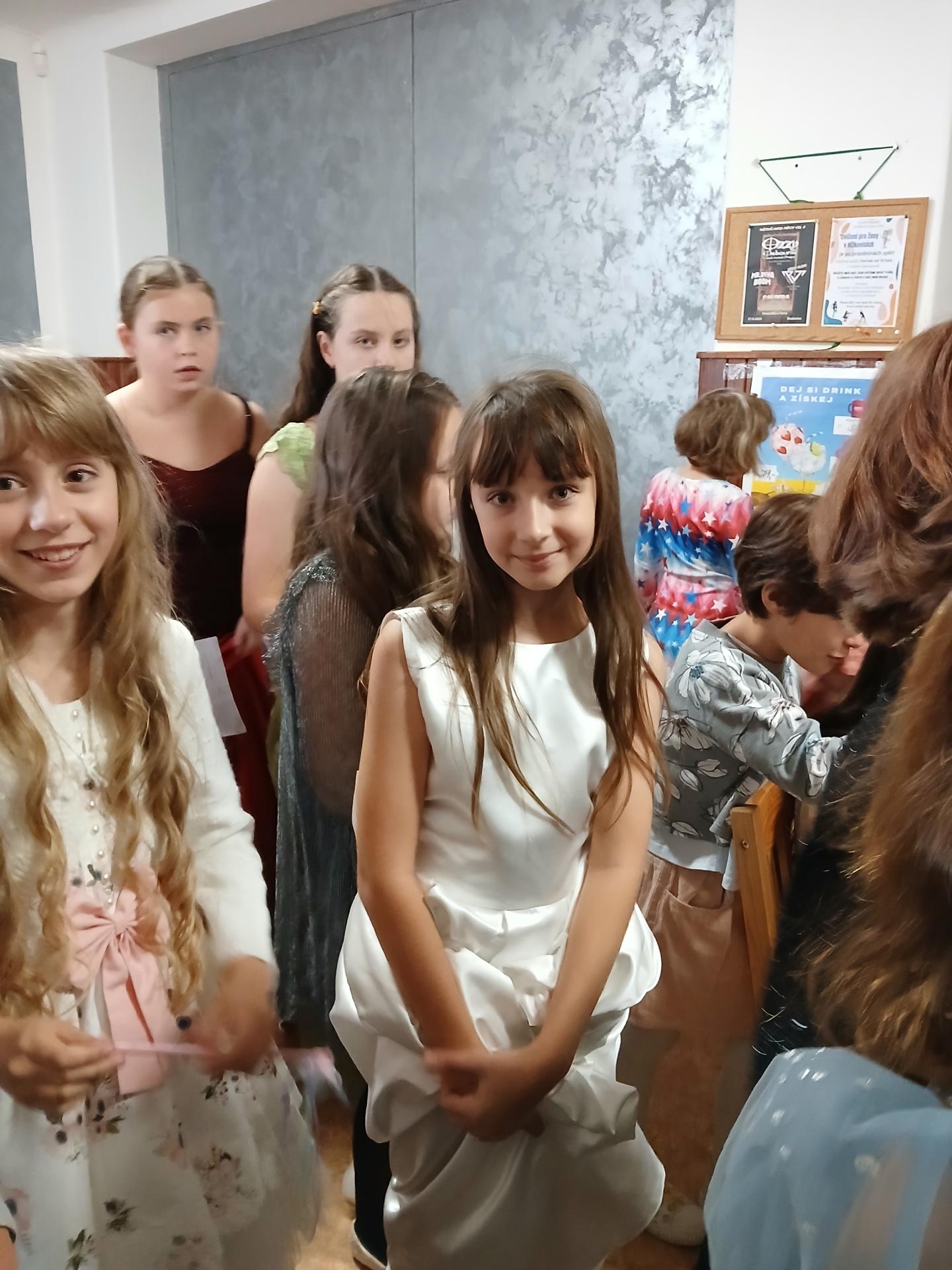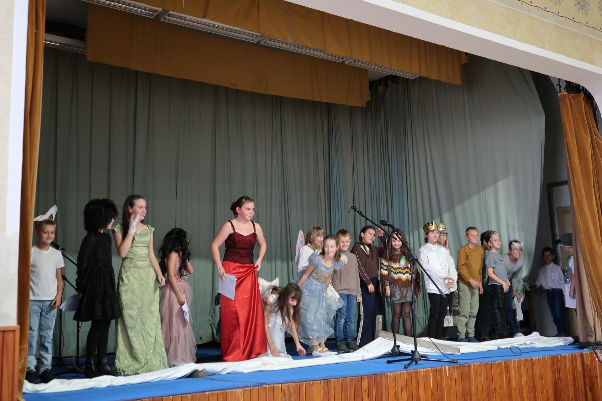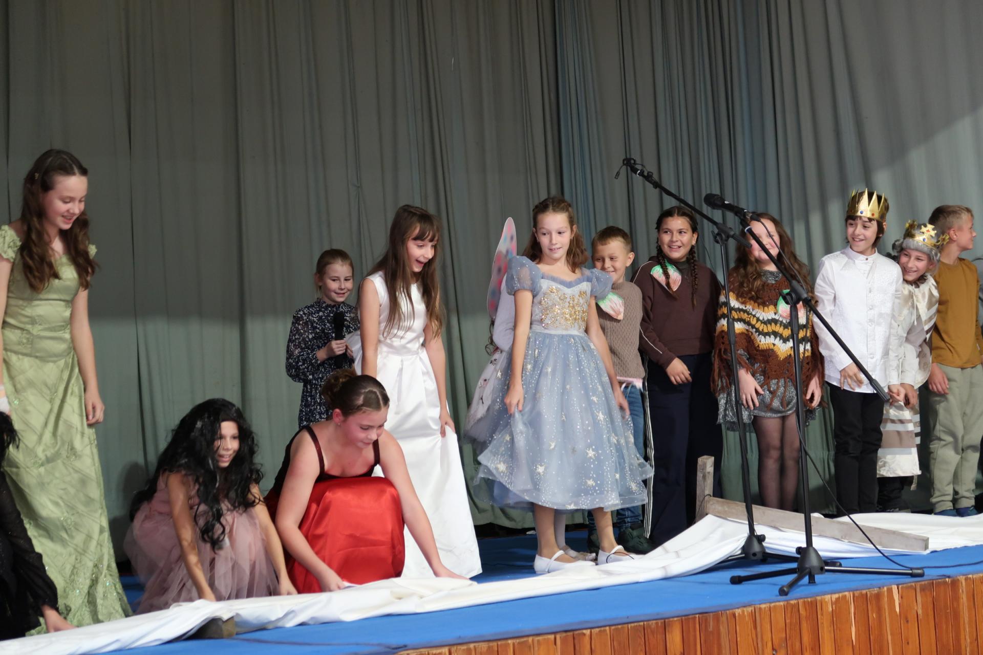 Po písničce přišla na řadu pohádka o Popelince v podání starších žáků. A že to nebyla jen tak ledajaká Popelka! Vystoupil moudrý král, princ okouzlující (hlavně sám sebou), zlé sestry s macechou, víla, krááásné šaty, střevíčky, oříšky, holubi, skromná popelka a na scéně se objevila i kukuřička s hráškem, kteří si kradli pozornost a s hrdostí hlásili, kdo je chutnější. Když vše skončilo sborovým „OK!“, měli jsme jasno – kouzla se dějí i bez hůlky, stačí trocha nadhledu a parta dětí, která si to prostě užívá.
