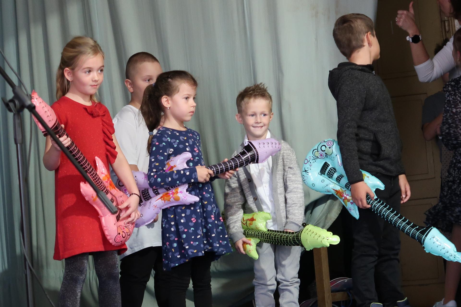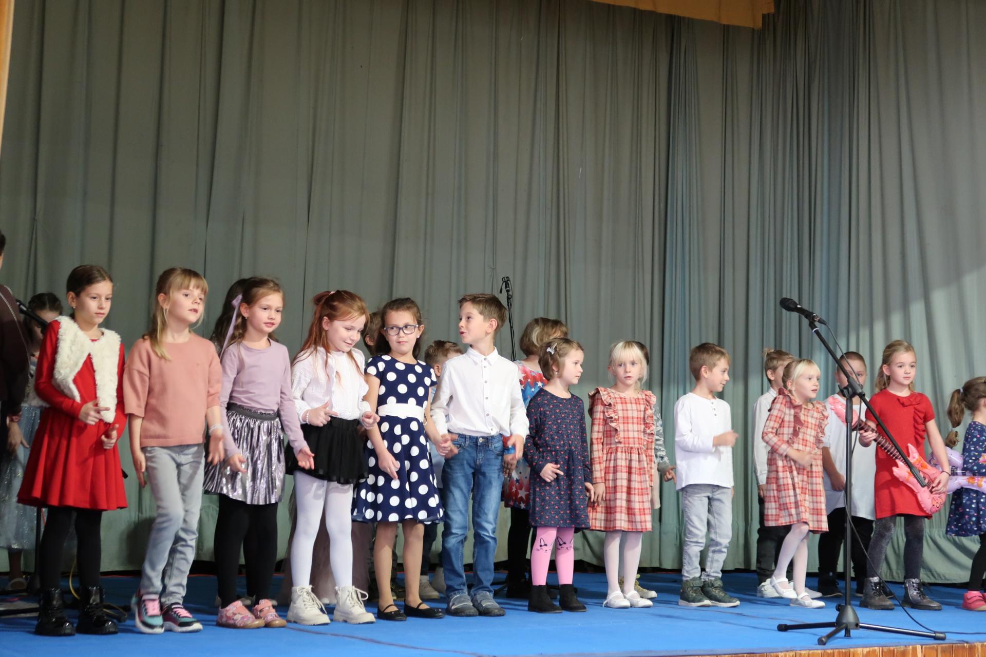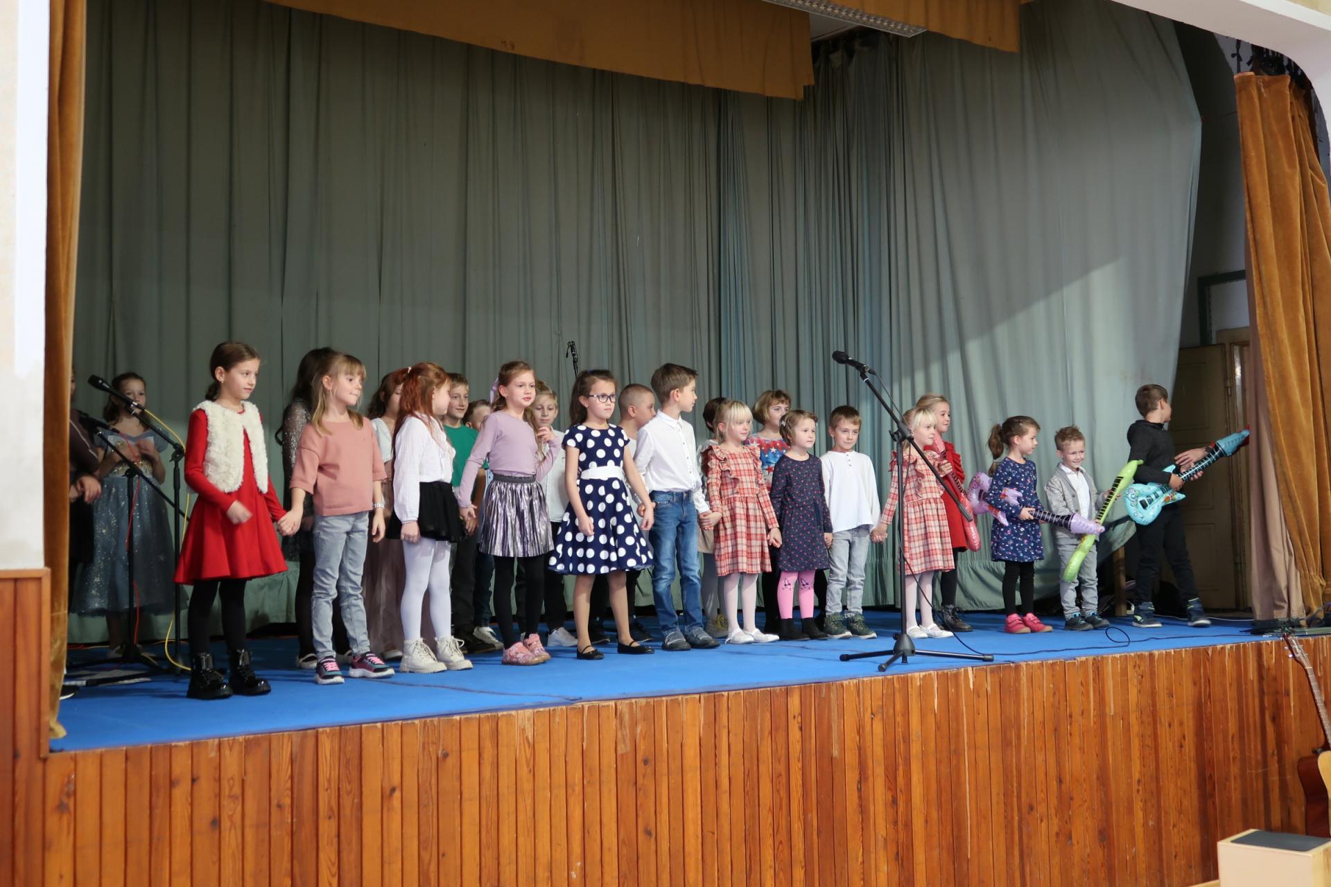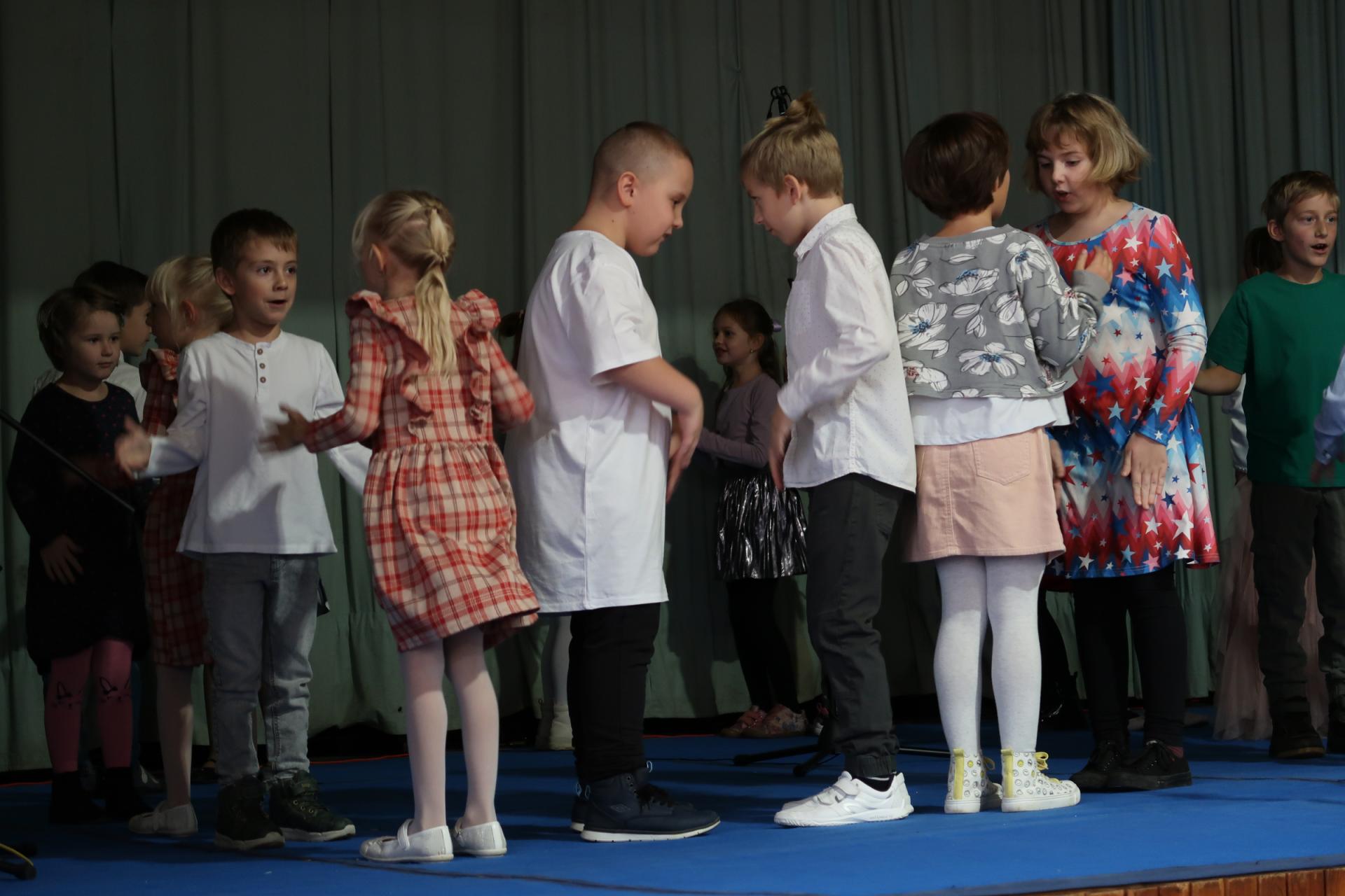 Úvod patřil krátkému scénickému vstupu s babičkou, dědečkem a jejich vnučkou, kteří přivítali hosty a uvedli celý program. Poté následovalo vystoupení našich nejmladších žáků, kteří si pro diváky připravili anglickou písničku „Hello“. Za doprovodu rytmické melodie zpívali o škole, kamarádech a společných hrách. Malí zpěváci a kytaristé rozzářili sál nejen svými hlásky, ale i tancem, úsměvy a nakažlivou radostí.